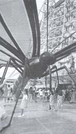 The greenhouse measures about 31 meters in height and approximately 56 meters in diameter. The outer frame is constructed of high precision steel and glass. Inside is a simulated rain forest, complete with rain, where you can walk along paths bordered by lush green plants and tall trees or relax by a waterfall. In the basement, is an aquarium featuring fish and other aquatic life from the Amazon River.