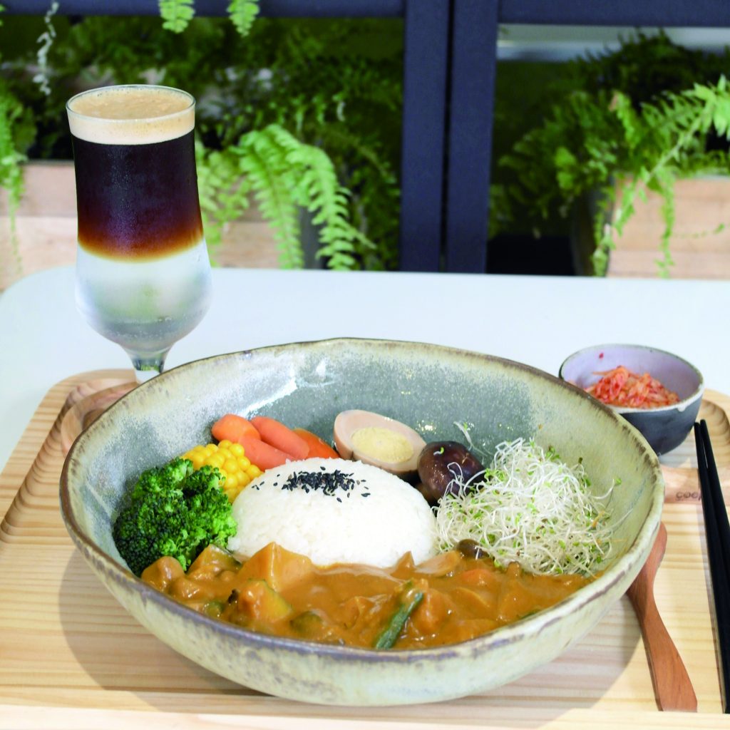 This spacious, well-illuminated shop, located on Taichung Museum of Fiber Arts’ second floor, features a broad expanse of artificial grass and wall-mounted ferns. The young owner aims to present guests with dishes created from vegetables he cultivates indoors with his agricultural techniques. This shop also serves coffee made from washed, honey-processed single-origin beans grown on an estate farm, priced at NT$100/cup. An epicurean, probiotic favorite, Civet Coffee (NT$300)–made Indonesian coffee beans consumed by civets, later picked out of their droppings and processed for safe consumption–has an earthy, smooth slightly-citrusy flavor. The gradient-colored, transparent to brown Sparkling Coffee, prepared with American-brand sparkling water, is mildly sweet and not bitter. If you’re hungry, a wide variety of set meals (NT$230), including Satay Chicken, Kungpao Chicken, and Braised Beef over Rice, are served with side dishes and black or green tea.