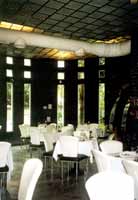 The restaurant’s innovative architecture often leaves customers talking more about the building than the cuisine. Gray brick walls with a tower on top gives People Cafe the appearance of a castle. The bricks are made from recycled materials so the design is not only impressive but also environmentally friendly. To enter the restaurant, walk up the winding staircase to the second floor. From there, it is possible to see the entire restaurant, making it easy for customers to select the table they like most.