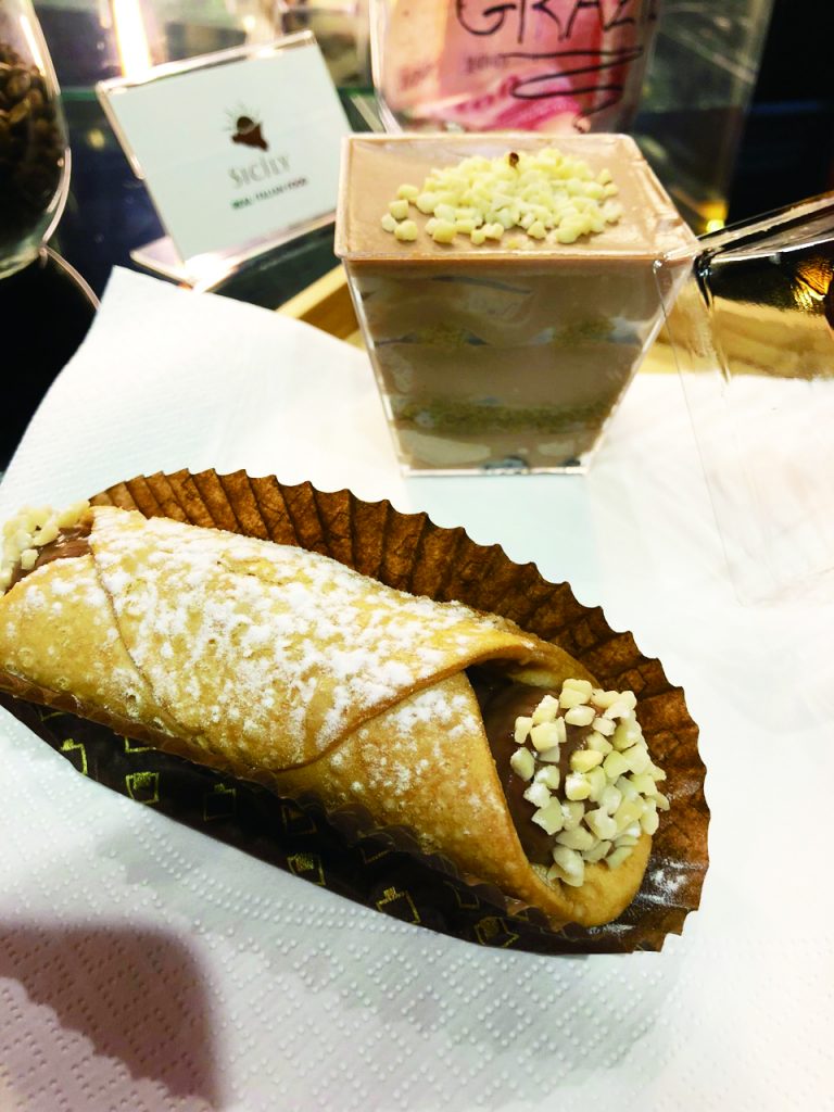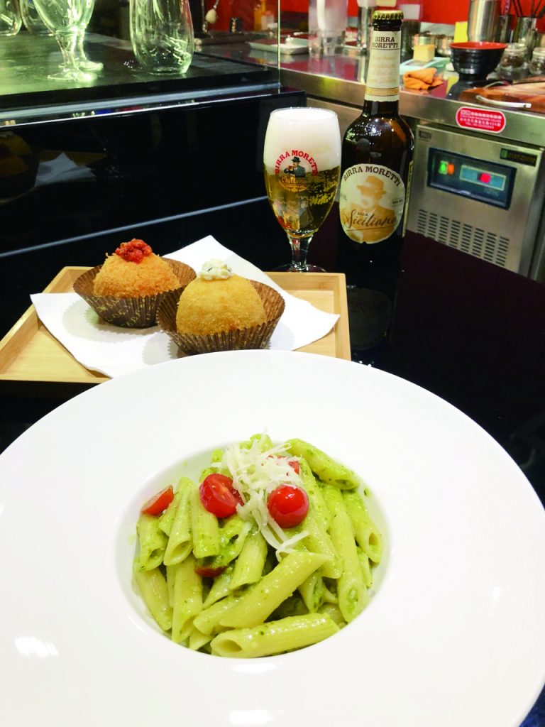 Pasta Al Ragu Alla Bolognese (NT$230) is flavorful but not cloying, prepared with basil paste, cherry tomatoes, deep-fried eggplant and cheese, while Pasta Con Salsa Al Tartufo E Scaglie Di Parmigiano (NT$280) is a simple, yet high-quality, dish. The traditional Sicilian dessert, cannoli, is made with deep-fried dough, wrapped around ricotta and dried fruit stuffing for a crispy, rich treat available in six flavors, such as Pistachio, Strawberry, Cream with Almond Slices (NT$99-129).