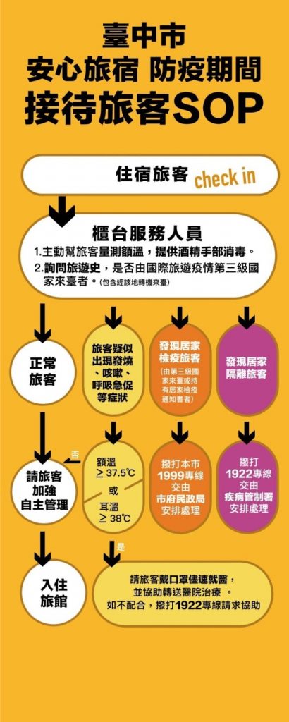 In accordance with Taiwan Centers for Disease Control policies and guest accommodation safety standards, Taichung City Government has implemented the following guidelines for Taichung accommodations: