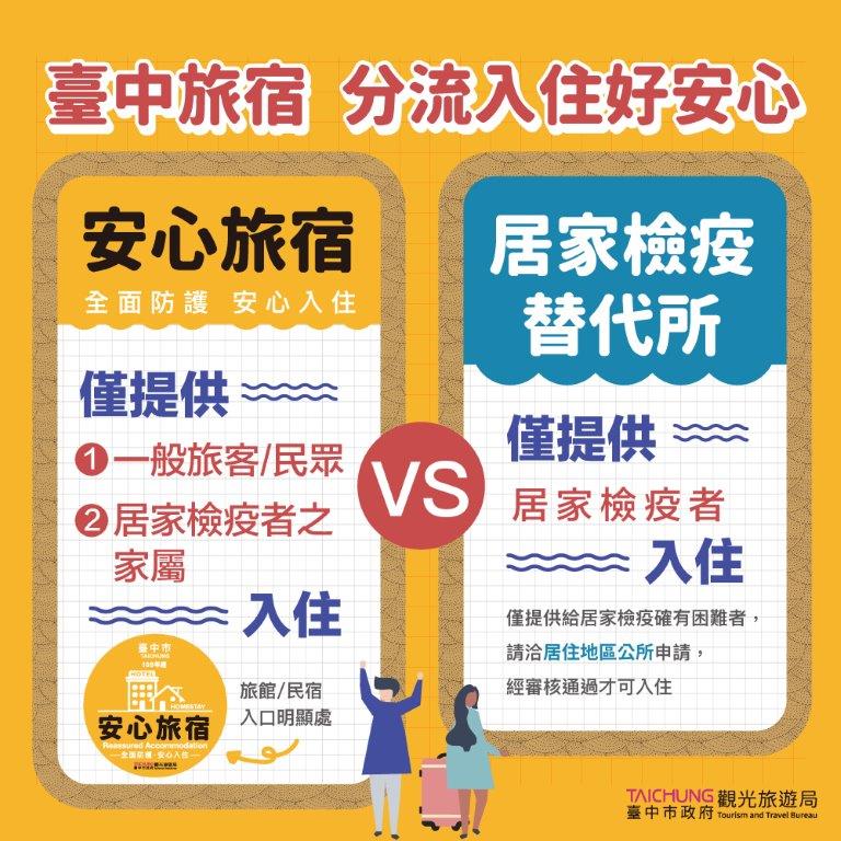 In accordance with Taiwan Centers for Disease Control policies and Taichung City accommodation safety standards and regulations, guest residences are required to strengthen pandemic prevention measures and are inspected by the Taichung Hotel Association and Taichung City Government Tourism and Travel Bureau. If residences pass inspections, they will receive a Reassured Accommodation Plan sign and can post it by entrances as a form of recognition. After this happens, the Tourism and Travel Bureau will continue to carry out unannounced spot checks of residences to ensure standards are being maintained.