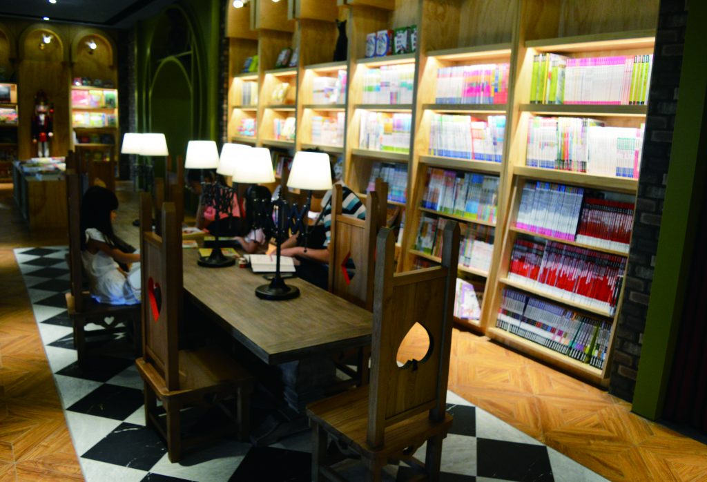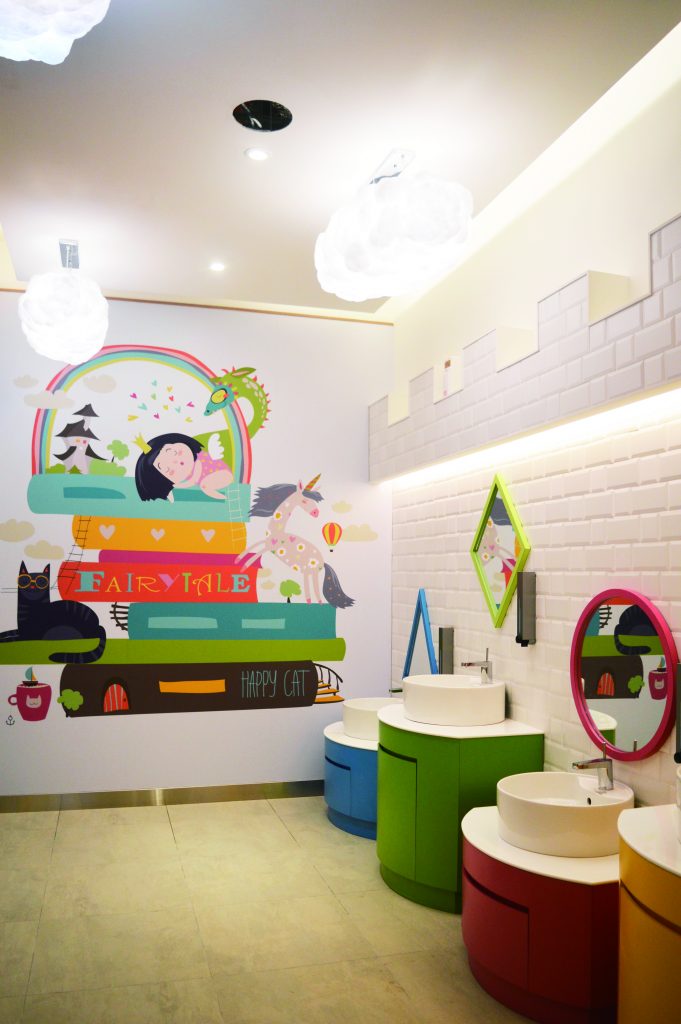 The fourth floor focuses on children and, at its center, has a large mushroom house that is a favorite spot for taking cute photographs. The surrounding shops offer games and fun kids’ toys, although there is also a massage chair retailer that appeals more to adults and senior citizens. Another adorable touch is found in the children’s bathroom, with mini sinks and toilets next to normal-sized ones of parents plus a ceiling decorated with fluffy clouds and walls painted in cheerful bright colors.