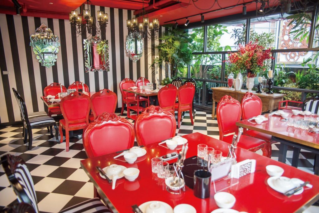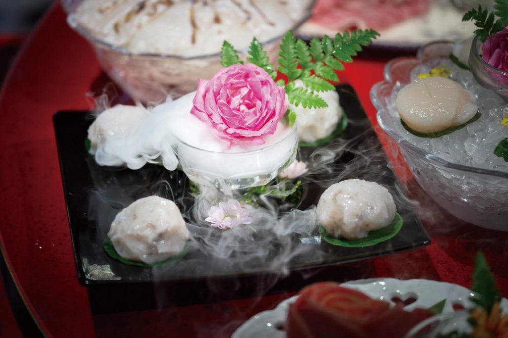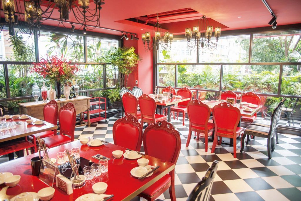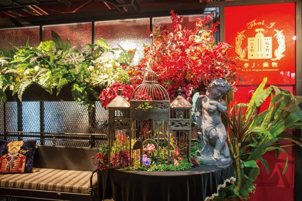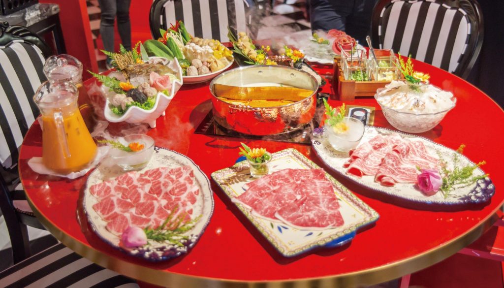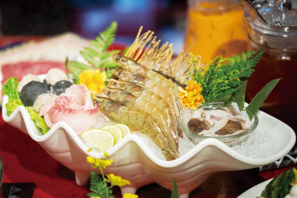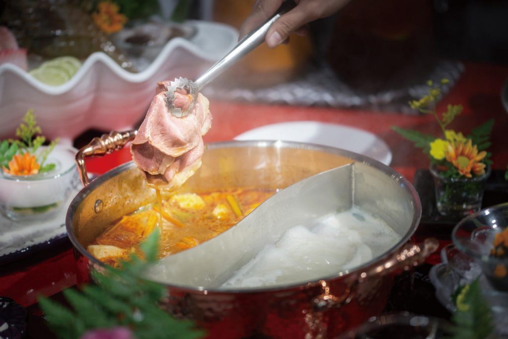 The royal castle-like atmosphere at Thai J restaurant, located in the first-floor of Carrefour Market building, is filled with plenty of plants and colors. The first-floor restaurant now has expanded to offer a second-floor Thai-style hotpot restaurant. A primarily black color theme, accented by sparkling, elegant chandeliers, creates a high-end ambiance. There are three unique soup-base options. Pork Tripe Stew Chicken, with a thick, white broth exuding peppery aromas, is prepared with pepper, vegetables, select pork tripe, and free-range Tonghua chicken. Coconut Chicken Hotpot (NT$780/large, NT$580/medium) is prepared with local native chickens, vegetables and bamboo fungus. Twin-Side Hotpot (NT$880) is a pot divided between a richly-flavored XO brandy soup base and Thailand’s popular Tom Yum soup. All these delectable broths can be enjoyed with fresh beef, scallops, beef tongue, fish filets, shrimp, handmade meatballs and other seafood.