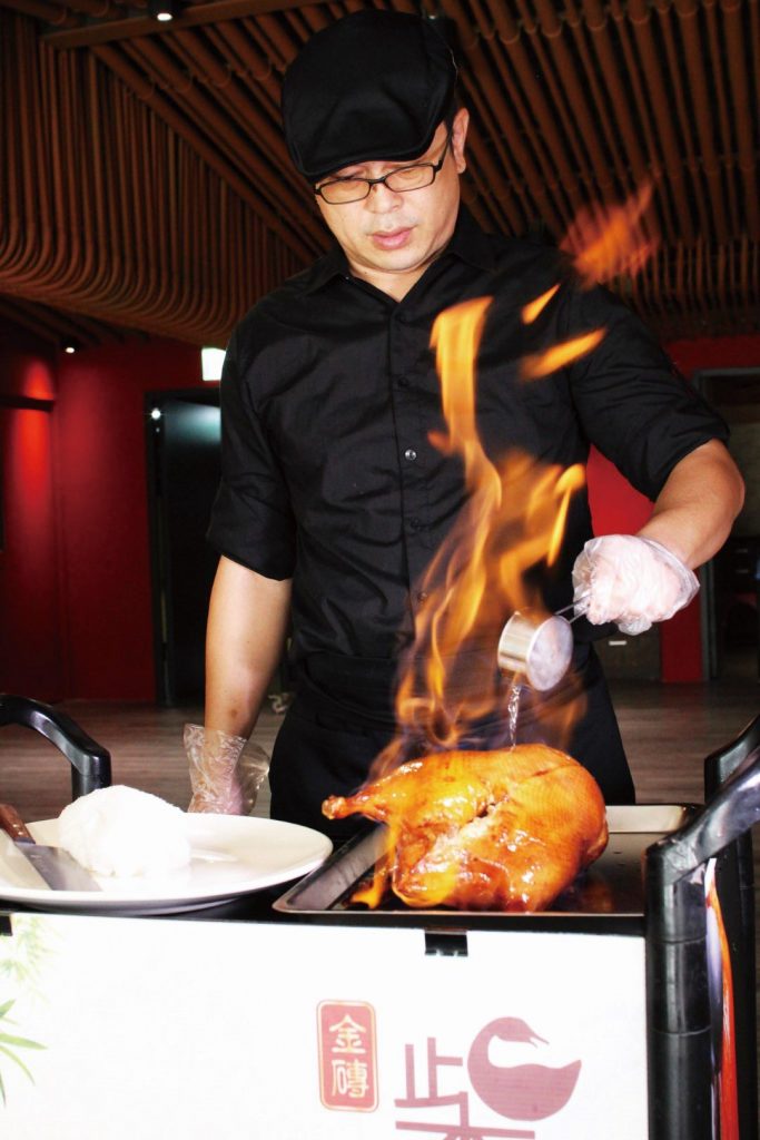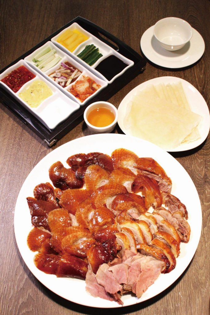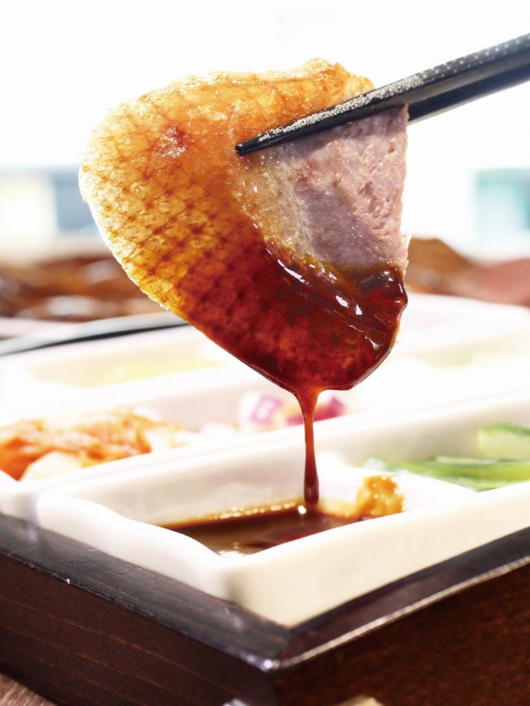 Many eateries offer three ways of enjoying roast duck but this place takes it to another level with about 128 variations, such as Duck Stir-Fried with Chilis; Salt and Garlic Duck; Sichuan Duck; and Korean-Style Duck. Nine available sauces and sides include pickled vegetables, chilis, orange sauce, mustard, and Japanese-style sauce. Fat Calf Hotpot Restaurant CEO Hong Ke-liang visited famous restaurants in Beijing and Canada to research roasted duck before returning home to devise his own delicious variation, smoked and roasted with longan wood, drizzled with aromatic Cointreau liqueur, and fired again before serving. The extra-fragrant, sliced Crisp Cherry Duck is folded in the thinnest wrap and the shop is promoting Classic Roast Duck (NT$2,080 for 4 diners; add NT$888 for side hotpot) with six types of roast duck dishes. Non-duck options include epicure favorites Fat Beef Spicy Hotpot, and Preserved Vegetable and Sliced Meat Hotpot; northern Chinese dishes Steamed Chicken with Chili Sauce (NT$260) and Sliced Beef in Chili Oil (NT$320); stir-fried vegetables, seafood, and tofu dishes.