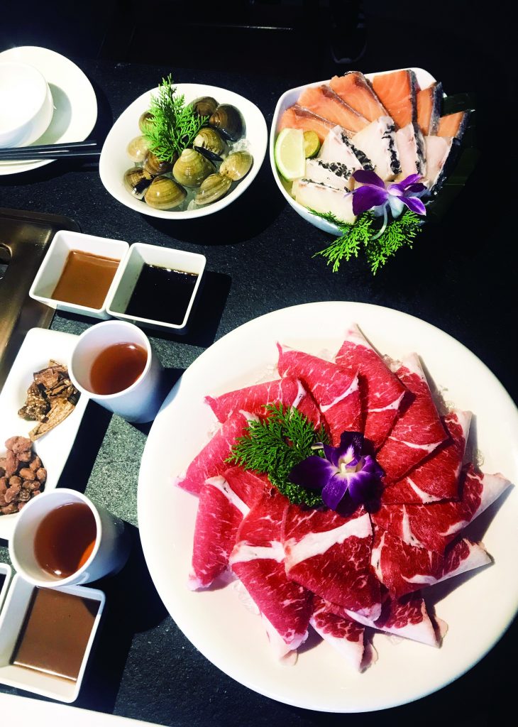 These Chinese spices and other ingredients are simmered in chicken soup all day and the menu offers five soup base options (NT$120/person), plus a shared hotpot with a bottom vent hood to keep the cooking odors away.