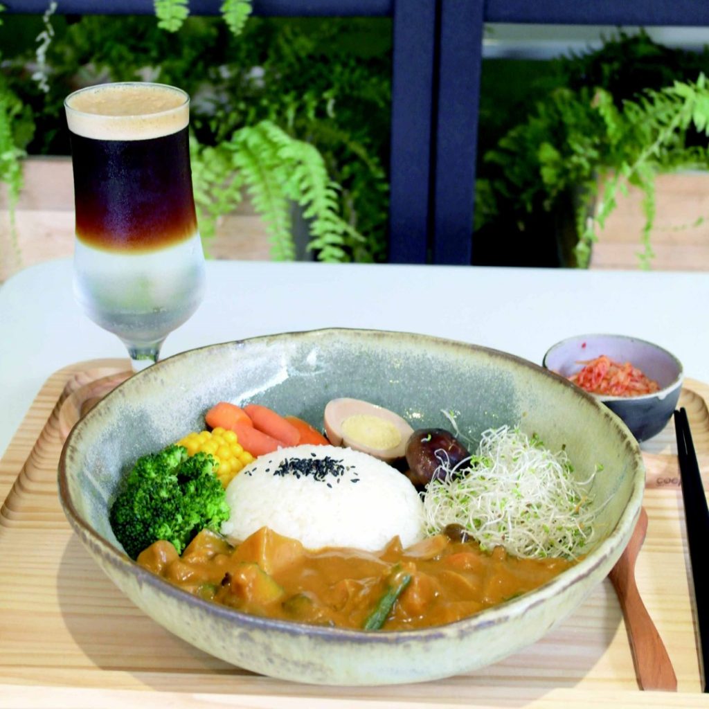 位於台中纖維工藝博物館的2F,寬闊採光佳,以綠色人工草皮鋪成的室內地毯,整場都是綠油油的地面,點綴牆上搭砌格子狀的蕨類植物盆栽。年輕有理想的店家想把自身所學的農業技術和森林綠化概念融入這片寬敞的室內咖啡環境中,日後更欲增加室內蔬菜植栽,呈現的餐點可以就地取「菜」,把室內農場搬上餐桌。目前以手沖單品咖啡為主,從精選莊園出品的各種日曬、水洗或蜜處理的豆子,單價100元,還有老饕愛喝的麝香貓咖啡(300元),來自印尼的咖啡豆經過改良以科技的方式培養出麝香貓咖啡生豆中的益生菌,喝起來更安全,入口淡淡的果酸並由味蕾釋放圓潤香氣,多喝幾杯也不覺心悸。咖啡氣泡飲用美式和氣泡水製作的漸層色咖啡不苦微甜,香氣縈繞。餓了也有豐富的簡餐沙茶里肌、宮保雞丁、紅燒牛肉飯230元等附小菜、紅或綠茶。