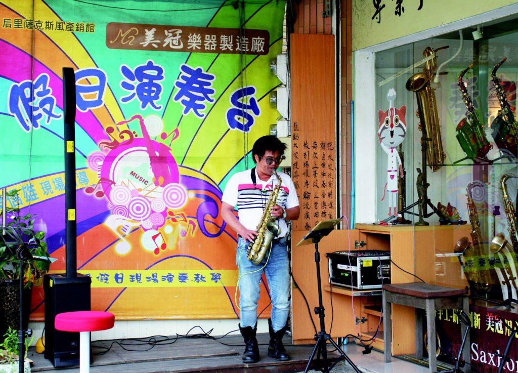 若是充滿好奇心的遊客,站在博物館前向對面的稻田望去,肯定會發現另一個驚喜,因為在那裡有一間經營40年的家庭工廠專門為國內外顧客製作薩克斯風:軒音樂器社。我首次發現,此處是為了幫美國的兒子找薩克斯風課程之故。周長慶在白天時製造薩克斯風,晚上則教學;他在某週六下午熱心地介紹製造薩克斯風的場地。我們從未參觀過如此真實的薩克斯風製造工廠(因為其他工廠無提供導覽),而我們也相當幸運地能讓友善又謙虛的周長慶帶著我們參觀。我的兒子在這裡短期與認真的與周長慶學習,我也相當感謝他能租借私人樂器給來自他鄉的我們。