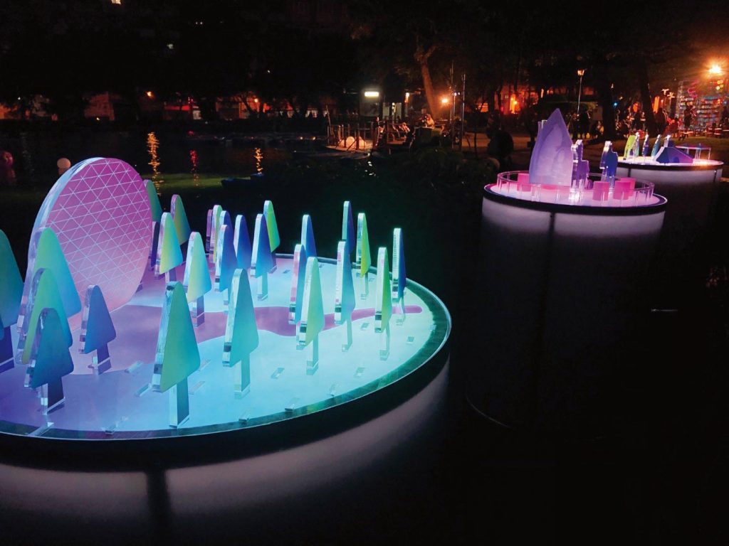 森林園區「森林秘境」: 以燈光藝術裝置呈現森林和民眾生活間緊密的關係,喚起眾人對自然環境的重視,並探討地球森林多樣性,伴隨影像聲音、故事敘述,呈現地球環境教育。
