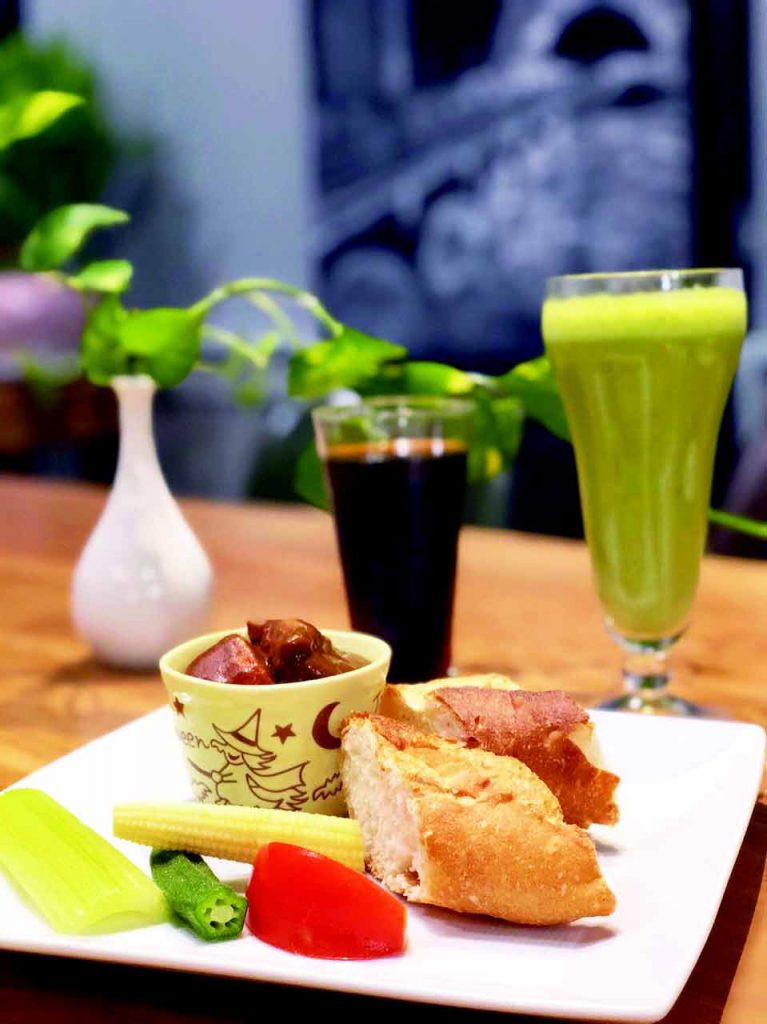 餐點以咖哩為主,David端出一道蔬食咖哩飯(150元),濃郁的咖哩香中帶著些許甜辣口感,來自花東的米飯Q彈好吃;以蘋果、幸鮑菇、玉米,等蔬食熬煮咖哩醬,讓人忍不住一口接著一口!咖哩醬是David在前一晚花了很多時間精心熬製,仔細品嚐發現這道咖哩美食雖無肉類,但是蔬食料理卻濃郁可口!冬日推出麻油薑特製蔬食拌飯/麵(附小湯)、暖暖粥(100元)!搭配一杯David特製的綠拿鐵、手工冰釀咖啡,吃得無負擔又健康!–陳怡芬/文 楊翰雯/譯