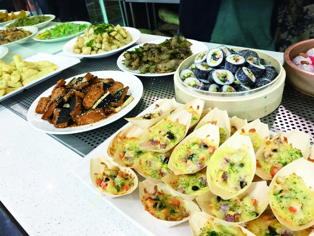 就算不吃素的朋友走進這家店也會感到很舒適,自然的光線、寬敞空間內點綴花卉與綠色植物,非常有現代感,和傳統的佛教素食自助餐嚴肅的氣氛不太一樣。前方長形的自助餐檯擺滿各種新鮮時蔬、將近10幾道的冷盤涼菜、沙拉以及多樣化熱騰騰出爐的現炒、炸物、炒飯、包子、壽司、紅燒茄子、創意拼盤、味道可口,其中乾煎豆腐,淋上特調醬汁,香鹹甜辣的綜合口感是我的最愛,配上香軟白米飯或五穀飯都很下飯,旁邊還有熱湯免費續加以及免費甜湯,今天是杏仁豆腐,濃濃的杏仁味、滑溜冰涼的口感,消暑解熱。菜色任君夾取完畢,至餐檯秤重計價,美味又健康。