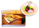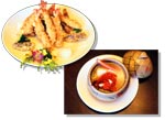 滋味鮮美的生魚片以美麗的拼盤方式呈現在越南製的金色漆器中,龍蝦及生魚片入口即化的口感,可見其鮮度,接下來還有好幾道美味的菜餚,包括鮮蝦蔬菜天婦羅配上榴?天婦羅,另一道非常有創意的美食是:將筍丁、肉末、海鮮及蔬菜煮熟後放置在挖空的筍殼中,上面再覆蓋一層香濃起司,中西合併的食材可說是美味及創意兼具 !