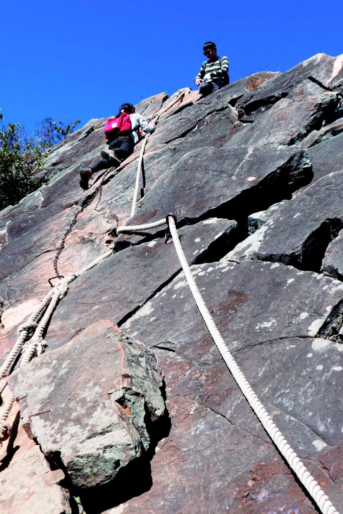 大眾化的登山口就位在大雪山林道27公里處,步行林間道路約一公里就會進入攀岩路段,從這裡開始,一路都是裸岩與攀繩,若你沒有下足決心挑戰,可別輕易嘗試。