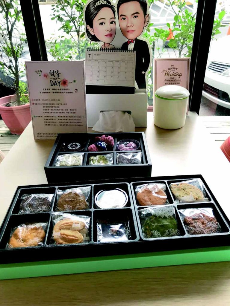以婚禮禮盒喜餅為主,是新人準備結婚時來挑選甜蜜喜餅的好地方,還有手工製作的幾十種不同口味的餅乾,客製化以及各種節慶應景的可愛馬卡龍,以翻糖製作的餅皮造型精緻又可愛,深受年輕族群青睞,酥脆的口感且含糖量降低,吃起來有著淡淡杏仁霜口味,光看一顆顆精緻小巧的外型,就可殺光不少底片,很捨不得咬它一口呢!