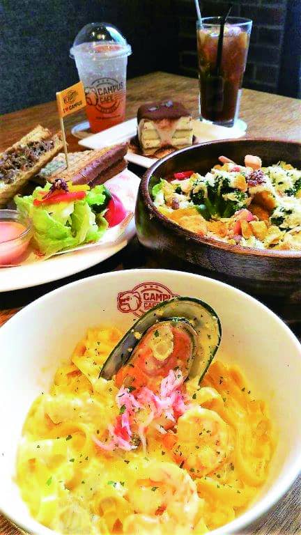 與台北同步,置身百貨公司一樓高檔彩妝專櫃一角,美式德州風校園輕食餐廳。播著體育節目的電視牆、掛滿運動旗幟的牆面;三明治、漢堡、義大利麵(120~380元),年輕熱情洋溢。超大份量招牌凱撒沙拉(220元)、新鮮羅勒青醬做成的蘑菇雞肉燉飯(200元),充滿辛香的青醬蠻符合青春的氣息。奶油明太子總匯海鮮扁麵(300元),一粒粒的明太子拌麵濃郁滑口,再來一份5oz美牛、起司、煙燻培根組成的經典起司漢堡(320元)大口吃,就是年輕!