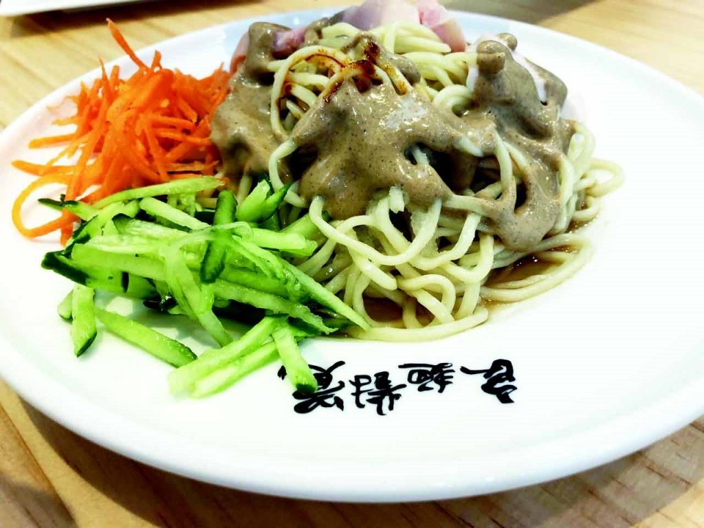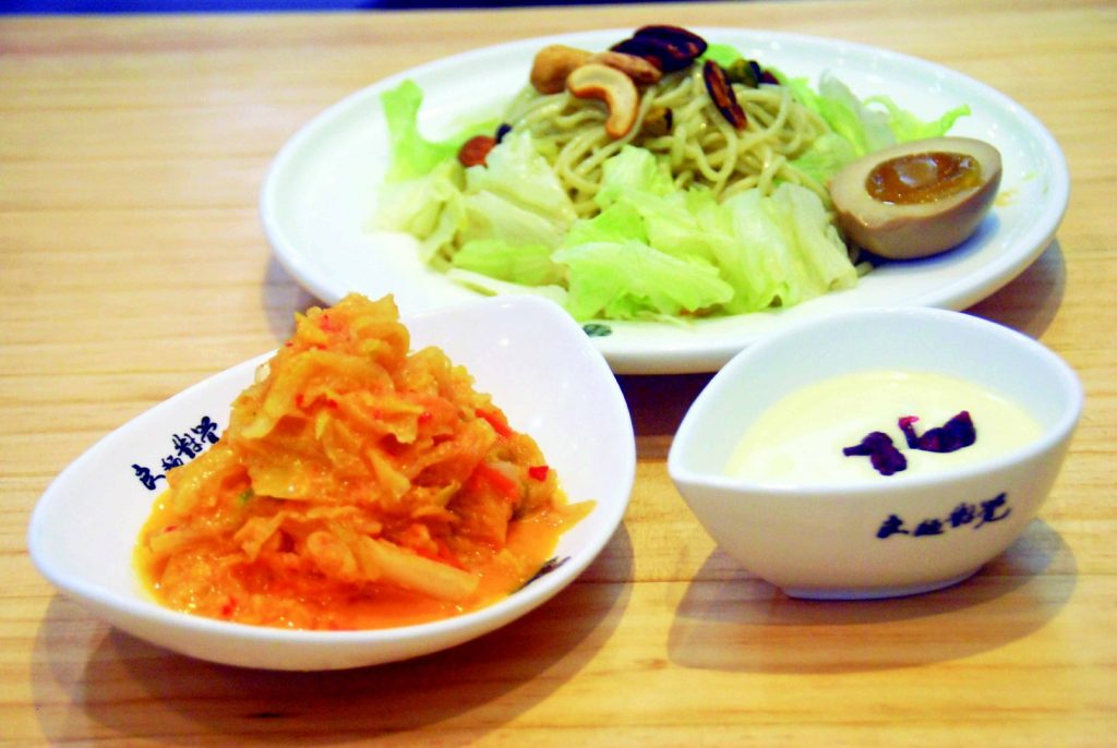 一進門看見大型玻璃窗內就像一家製麵廠,從使用過濾的軟水、麵粉、科技的除菌設備,經紫外線UVC系統除去掉雜質和細菌,並且經過SGS檢驗,出品的麵條完全沒有大腸桿菌。沒想到來吃這一碗小小的涼麵,背後卻有這麼多的付出和研發。6種不同的涼麵口味,從傳統的芝麻醬到泡菜、堅果優格、舒肥雞胸,滿滿一盤,入口彈牙的麵條,沒有鹼味卻帶著絲絲麵香,攪拌不同的醬汁就變化出口感清爽或濃郁的美味,價格45-65元,真正吃得安心。油蔥乾麵(45元)以豬油和紅蔥調和拌麵,簡單清香,炙燒舒肥牛小排麵/飯(320元)以美國PRIME牛肉,特調醬汁醃漬經22小時舒肥再炙燒,香氣四溢入味,軟嫩多汁,另有小菜-豬舌、豬頭皮、豆干、鳳爪等 (50-90元)。