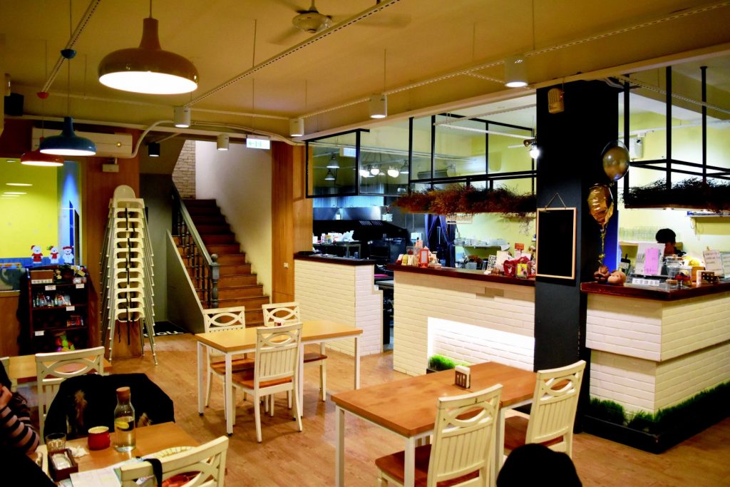 專為孩子特別設計用餐環境的店家,也供應家長們一個能好好享用美食的地方。一旁有沙池、黑板畫板與可以讓孩子跑跳的空間,家長也能選擇在戶外陽台區邊看孩子玩耍邊用餐;另外還有一處扮家家酒玩具區。主廚Gary在台灣已擁有十多年的義式與法式料理經驗,他的手作餐點包含亞洲風味西式早午餐、義大利麵與燉飯。菜單中特別的餐點包含香辣避風塘義大利麵佐酥炸軟殼蟹(328元)、檸檬奶油義大利麵佐乳酪鮭魚捲 (348元)與較為健康的嫩煎櫻桃鴨胸搭配藜麥與水果沙拉(328元)。寶寶賽車餐(168元)涵蓋了義大利麵、水煮蛋、地瓜與薯條;麵類與薯條也能以米飯、水果或其他餐點取代。2樓另有提供舉辦兒童生日派對的寬敞空間。