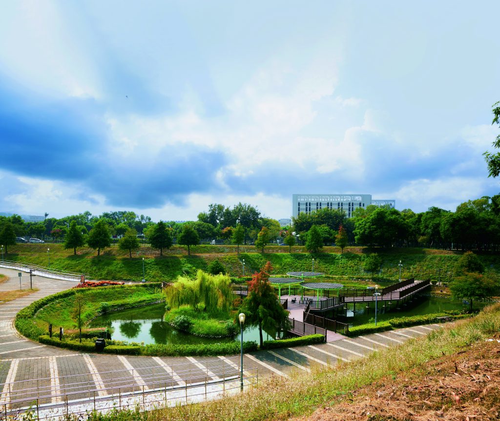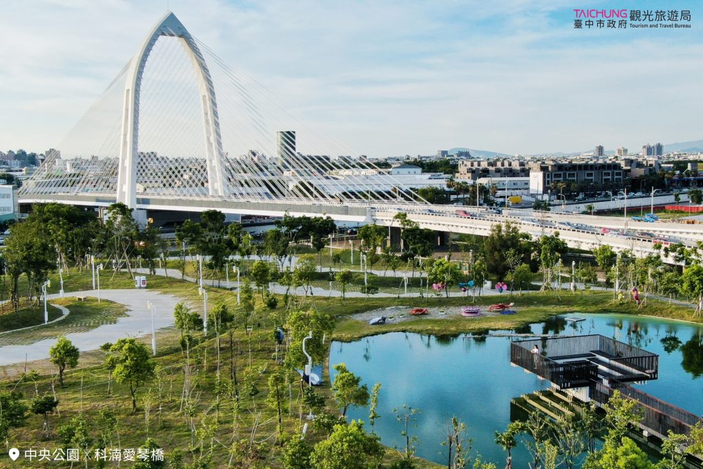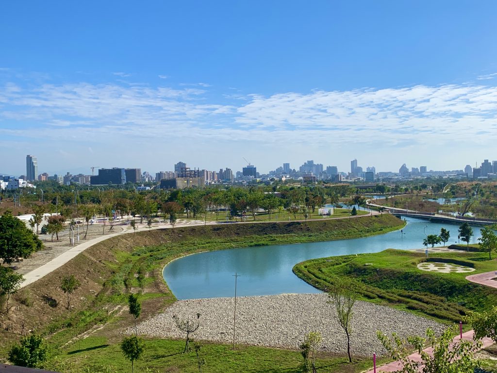 |城|城市綠洲─中央公園 位於交通網絡四通八達的水湳經貿園區,使用綠色植栽呈現不同風貌的地景設計,初春時節還有櫻花綻放,園區內更設置了獨步全球的十二感官互動設施,廣受市民歡迎。