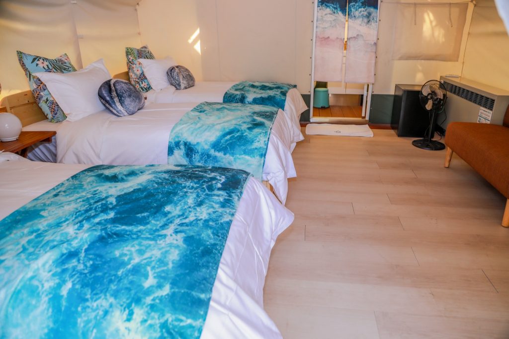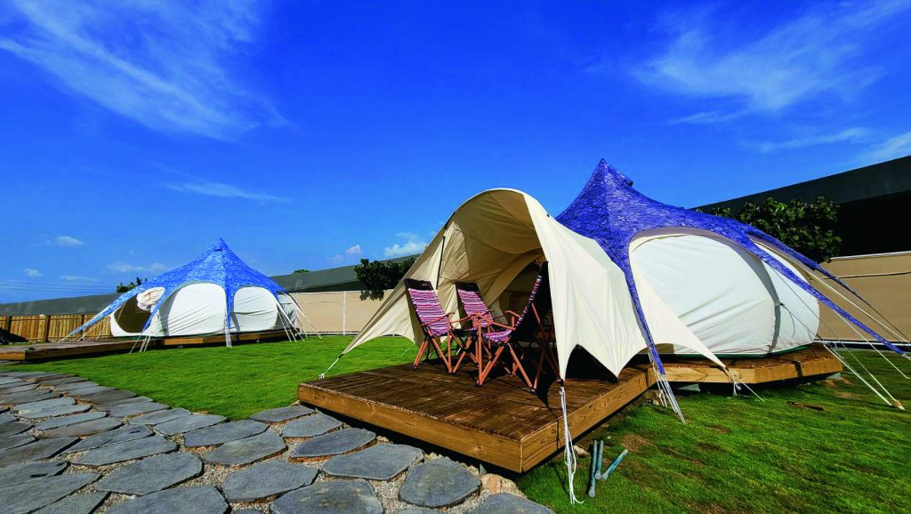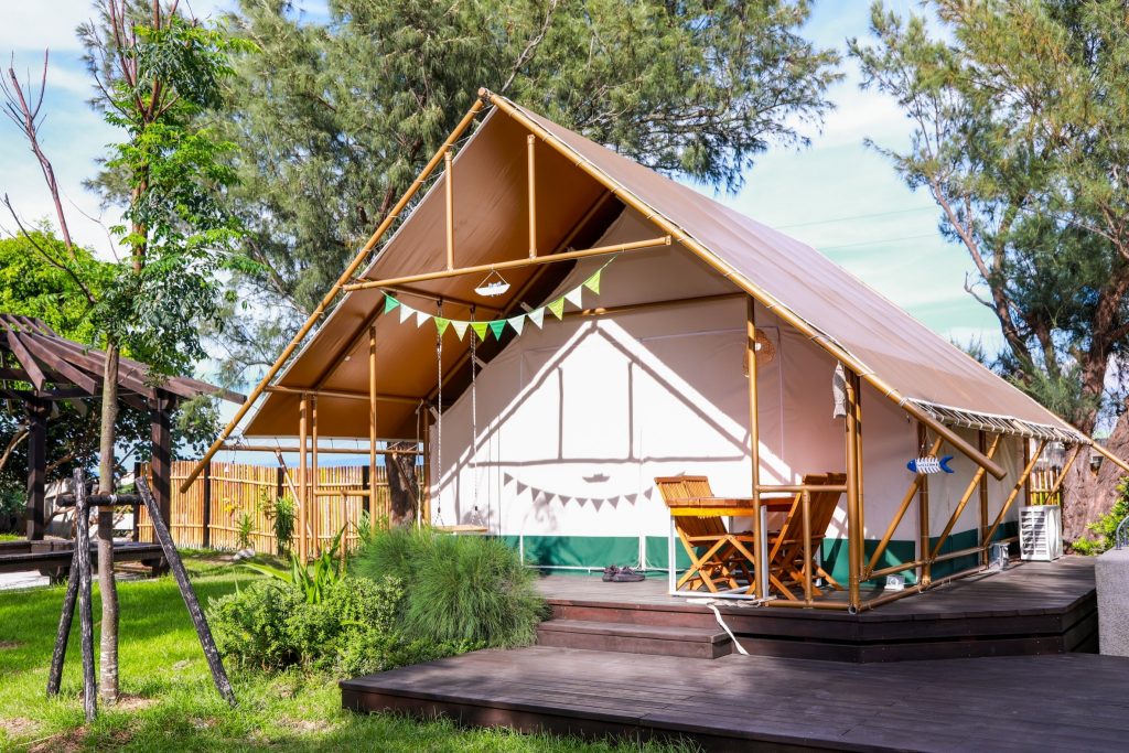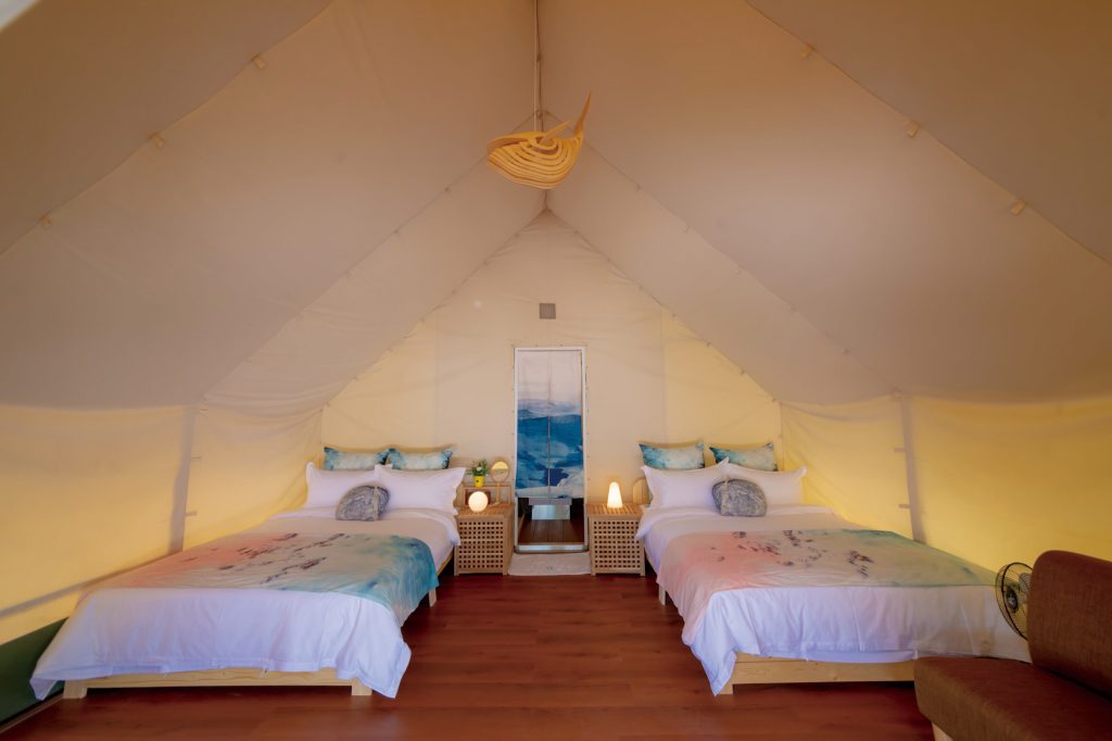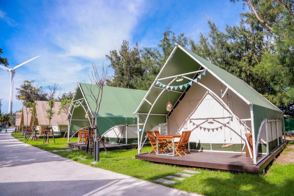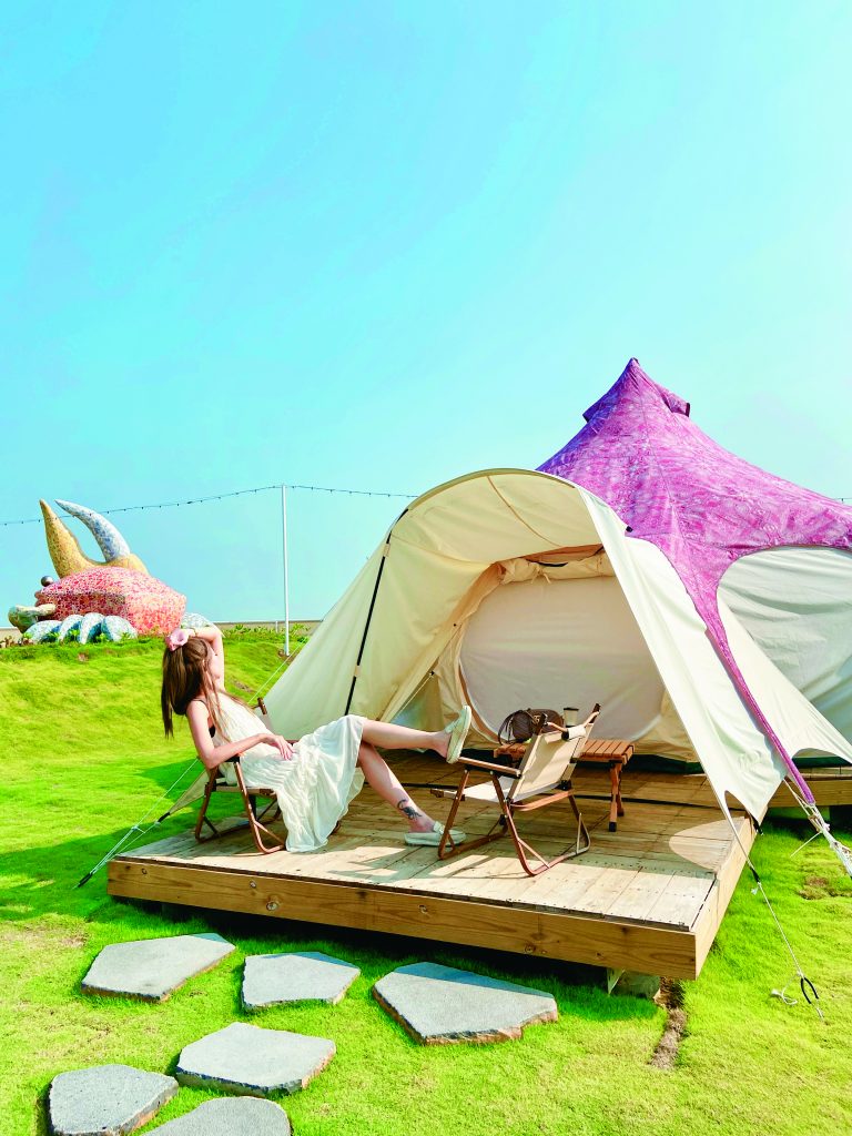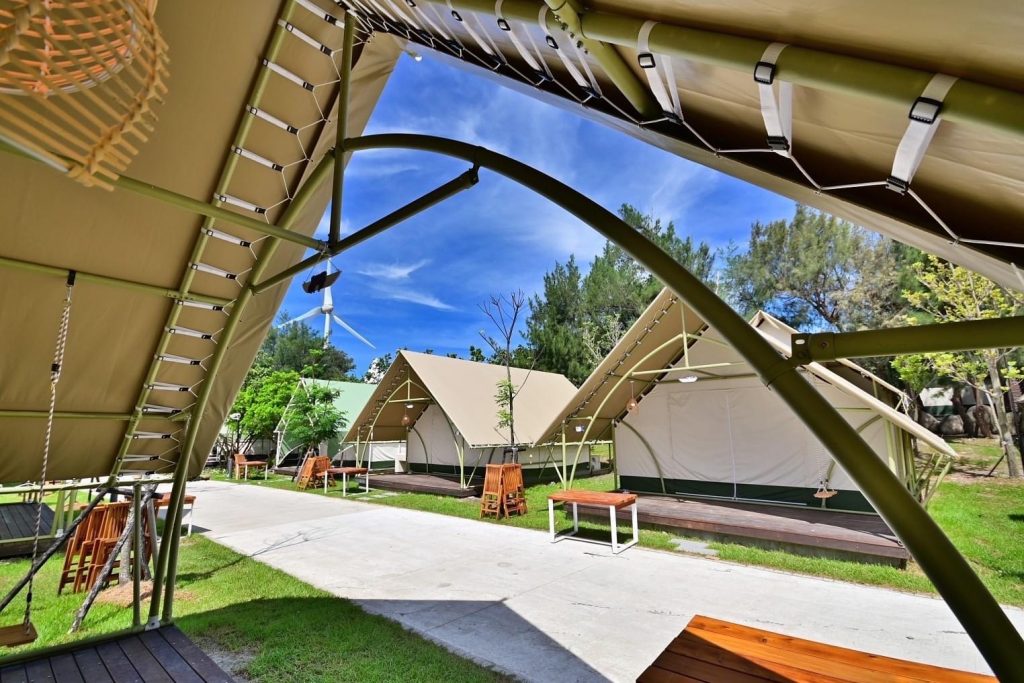 向海那漾 位於大安濱海樂園內,提供早、晚餐Buffet及下午茶,帳內設備一應俱全,帳戶外還設有鞦韆椅。充滿異國情調的「納海木屋帳」可遠眺海景非常受歡迎!此外,還有夏季限定的戲水池、兒童遊戲塔、大草坪等各種休閒設施,並經常舉辦各式活動,如手做彩繪、假日瑜珈、生態導覽等。只要簡單行李,就能說走就走,輕鬆入住,聽著海聲入眠。