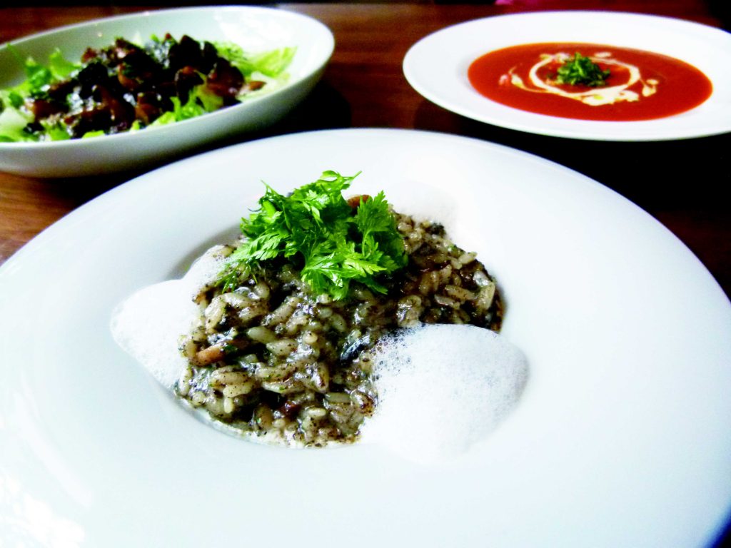 餐點主要以法、義料理為軸,菜單設計講究食材品質與季節性,並堅持從麵包到主菜皆手工自製。夏季推出油封鴨胗溫沙拉(320元), 適合搭佐杯沁涼的白酒或香檳開胃,湯品則有口感滑順細緻的番茄鮮蝦濃湯(180元),與不定期更換的例湯選擇.而主廚也誠心推薦黑松露野菇燉飯(480元)和各種佐酒的開胃菜。其他輕食、燉飯、義大利麵和比薩等餐點與飲料全天候供應,推薦給喜歡小酌的朋友們到此享受歡愉的時光。