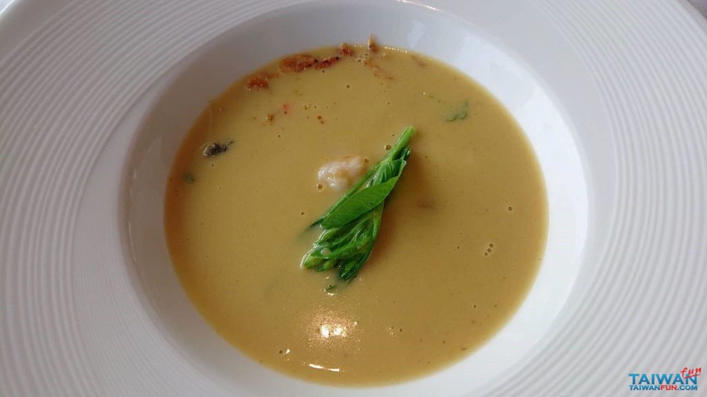 菜單上6款午間套餐,我挑選了6盎司的美國極佳級翼板牛排(980元)。其他相同美味的選項還包含美國蛇河農場極黑豬帶骨里肌(980元)、加拿大波士頓活龍蝦(1680元)與美國極佳級冷藏菲力(1680元)。套餐(含麵包與咖啡/茶),首先上來的是凱薩沙拉與舒肥多汁的牛排,接著是充滿蟹、貝殼類、乾蝦等各式海鮮的奶油南瓜湯。多汁又具備風味的牛排主餐,建議吃三分熟,一旁搭配亮眼的蔬菜包含梨子片、點綴黑蒜醬、炸蒜片與甜蘿蔔醬。佐海鹽、紅酒鹽、與黑鹽,另有松露、黃芥末與紅酒醬不同風味選項。這份高級主餐之後,還有巧克力覆蓋堅果的慕斯蛋糕搭配水果。