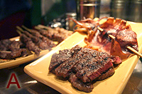 肉串有牛肉、豬肉、羊肉(每串40元),經過一天獨門醬料的醃漬,灑上孜然粉等香料,品嘗獨特的大漠邊疆風味。牛小排(80元)和羊小排(40元)烤的恰到好處,肉汁飽滿,讓人回味無窮。這裡的炭烤魷魚(80元)又滑又嫩,恰到好處。