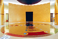 參觀者沿著步道牆的朝聖圖像緩緩前進,可一路思考生命的問題。2.【金色大廳】- 如同宇宙般的大廳,其兩旁鑲嵌金色馬賽克的兩根大柱上,以14種語言刻著「愛是我們共同的真理,和平是我們永恆的渴望」等二句箋言,正是世界宗教博物館的創管理念。3.【宇宙創世廳】-提供參觀者一個具有高畫質的劇場,並可從12分鐘的影片中了解各宗教的創世觀。經過創世廳來到6樓的【生命之旅廳】-