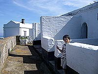 台馬輪緩緩駛近中柱港時,只見碼頭前三位海軍士兵筆直待命,船繩一拋出,阿兵哥迅速確實的綁好纜繩,看著碧海藍天青山的感覺真舒服。租台摩托車先到最遠的東湧燈塔,瞧瞧最北邊海角上的三級古蹟,海天一色加上白色梯牆及燈塔,你可以感受到希臘愛琴海的風味,只因這1904年的英國式燈塔區,彷如是18世紀別墅般佇立在碧草如茵的海角邊。穩重並且驚豔的燈塔高14.2公尺,不似其他燈塔瘦高,其後方的房舍、雞舍、豬舍都是可拍出愛琴海風光的好景點。聰明設計的房舍,下方有四個收集雨水的蓄水池,而窗台下方也有凹樔可防窗邊積雨滲入屋內,細微人性化的建物,精緻的像座迷你城堡。還有請別遺漏下方有兩座與燈塔海角天涯共此時的霧砲及霧笛。